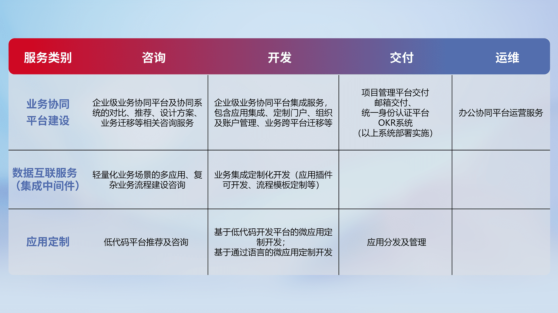 针对钉钉、、、、企微、、、IDaas等平台级产品提供产品的规划、、、、方案、、、、交付、、定制化开发等服务,,,,实现如统一协同办公、、、、智能客户服务、、、混合会议管理、、智能数据查询、、等业务场景,,,,实现数字化转型。。。。