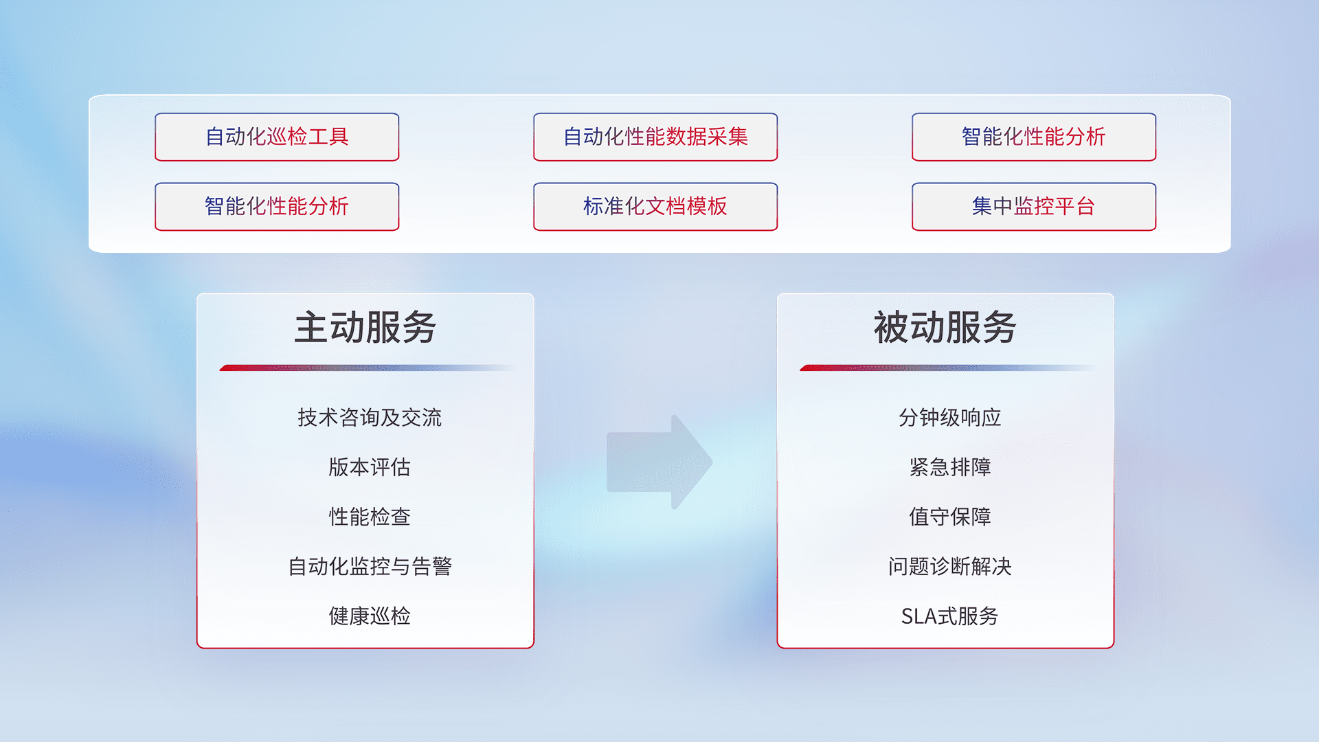 智能化工具和标准化文档,,,保障服务质量,,,提供主动服务(包含技术咨询、、、、版本评估、、、性能检查、、自动化监控与告警、、、健康巡检)和被动服务包含(分钟级响应、、、、紧急排障、、、值守保障、、、问题诊断解决、、SLA服务)。。。。